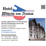 Die schönen Städte Diez sowie Limburg an der Lahn haben so einige Schätze die es zu entdecken gilt. Freuen Sie sich schon jetzt auf ein paar wohlverdiente Tage und entfliehen Sie dem hektischen Alltag. Lassen Sie sich für eine schöne Auszeit in das Hotel Wilhelm von Nassau entführen.